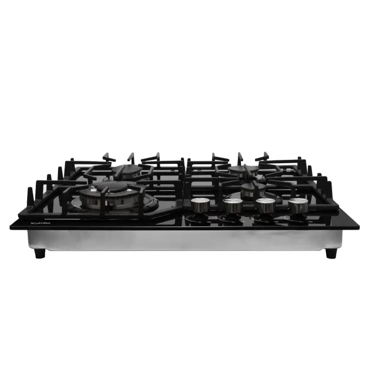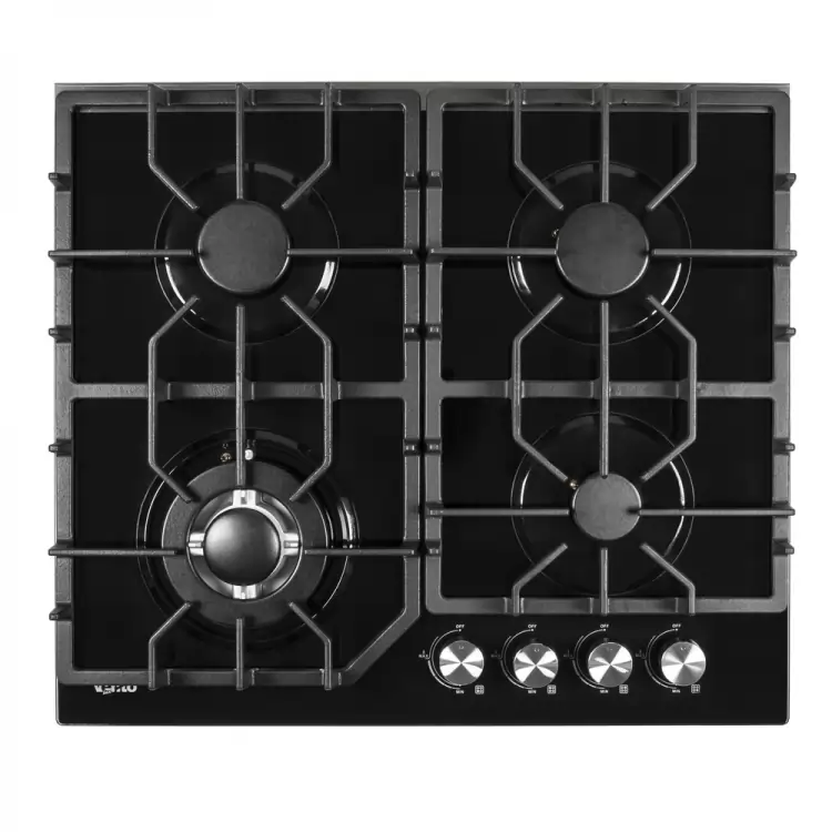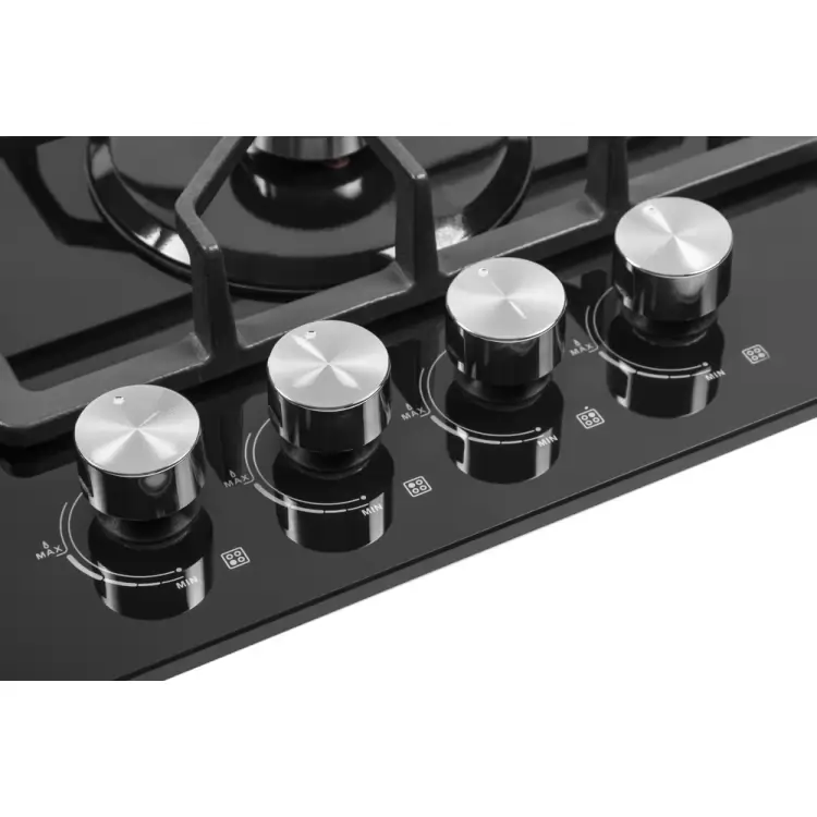 Робоча зона виконана з жароміцного скла, товщина 8 мм. На ньому розташовано 4 газові конфорки - 0.83 до 3.5 кВт. При цьому найбільша турбоконфорка розташована спереду зліва, таким чином вдалося вберегти стіну та ручки управління від зайвого нагрівання. Ручки, до слова, виконані з жаростійкого пластику, а зверху декоровані металевим ковпачком. Вони розміщені праворуч від великої конфорки.