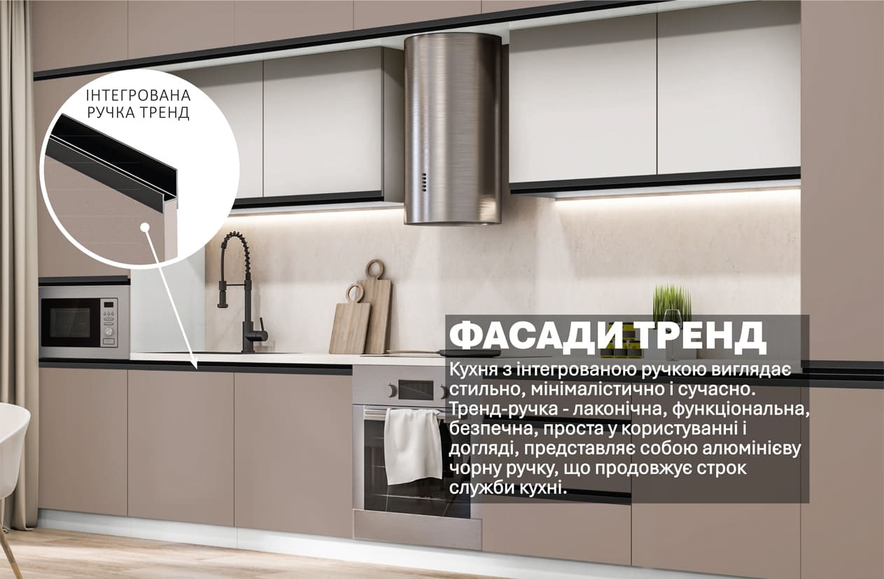Матеріал фасаду - ДСП 16 мм, з інтегрованою алюмінієвою ручкою.