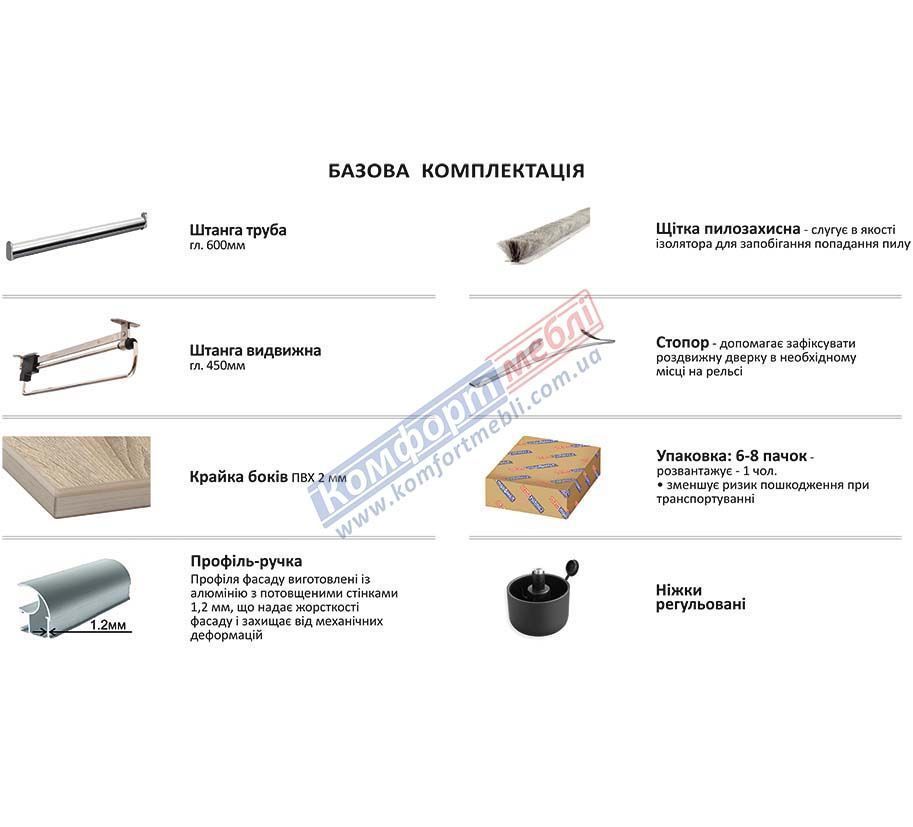 Глибина 450 мм: • Висота 2100 мм - 11851 грн. • Висота 2200 мм - 12100 грн. • Висота 2400 мм - 12474 грн. Глибина 600 мм: • Висота 2100 мм - 12776 грн. • Висота 2200 мм - 13045 грн. • Висота 2400 мм -13448 грн. Ціна за колір профілю (+ за один фасад): • Білий, Золото, Шампань, Чорний + 223 грн. • Баварія білий + 747 грн. • Баварія графіт + 1494 грн. |