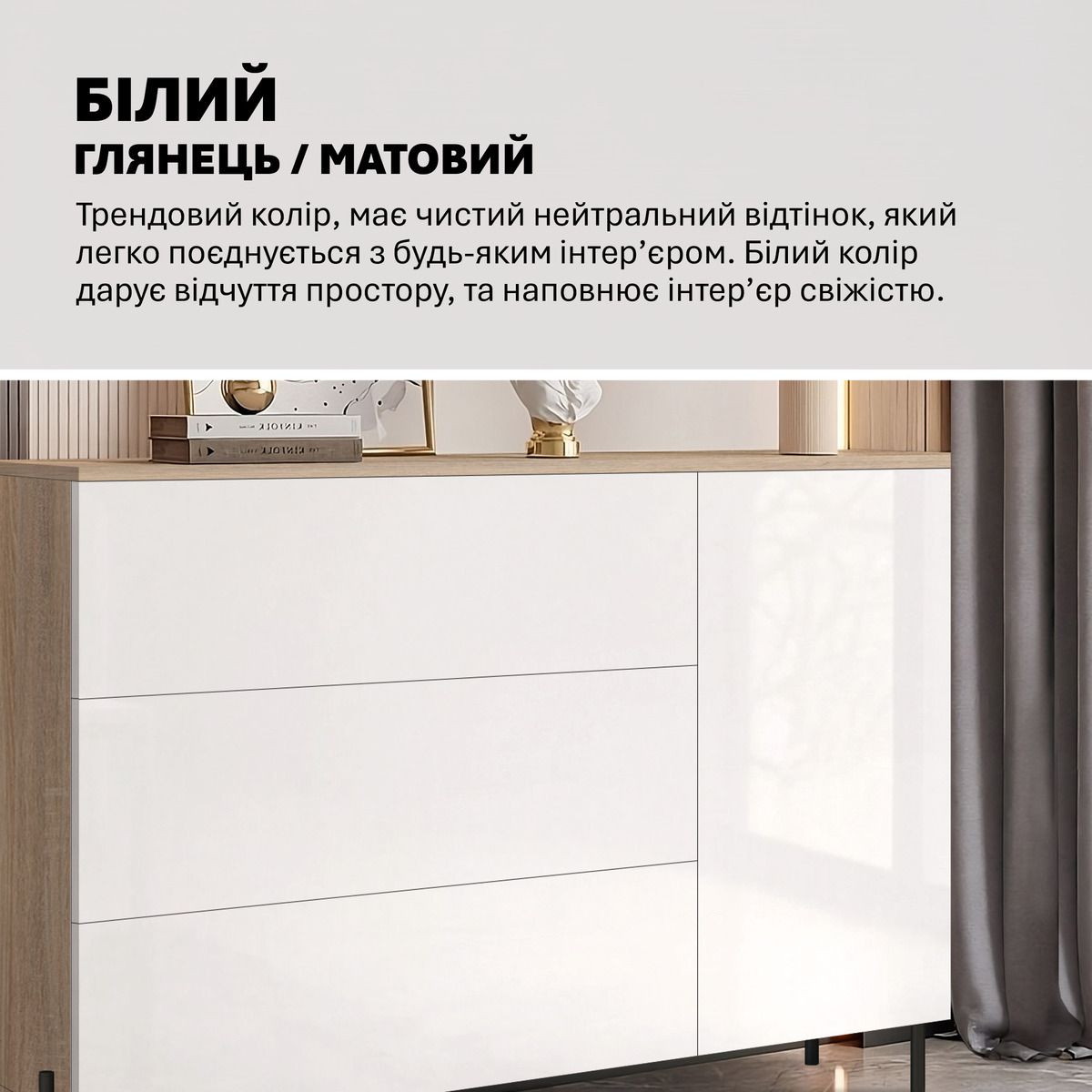 The Flex handleless chest of drawers is a stylish solution for your bedroom. Convenient and compact, it is 120 cm wide and is ideal for organizing clothes and accessories. The white facade gives the interior elegance, and the absence of handles creates a minimalist look. The main advantage is the ability to harmoniously fit it into any design, while maintaining functionality and order. Fill your bedroom with comfort and style with the Flex chest of drawers! Available for purchase with delivery in Kyiv, Ukraine.